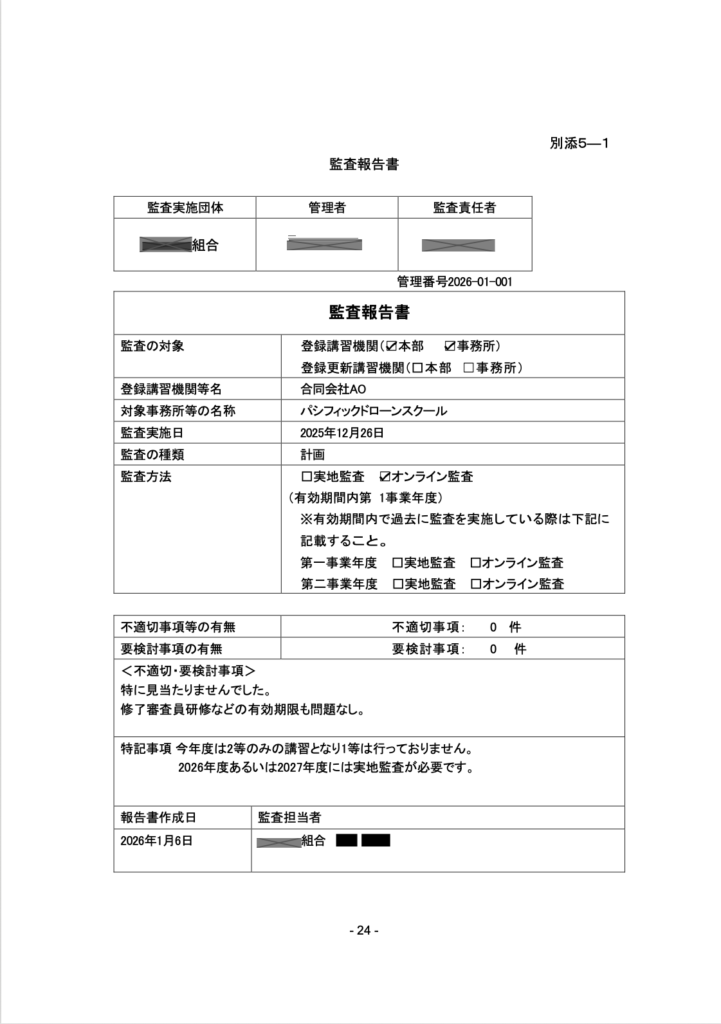 弊社パシフィックドローンスクールは、2025年12月26日に、ドローン国家資格の登録講習機関として年に一度の監査を受けました。